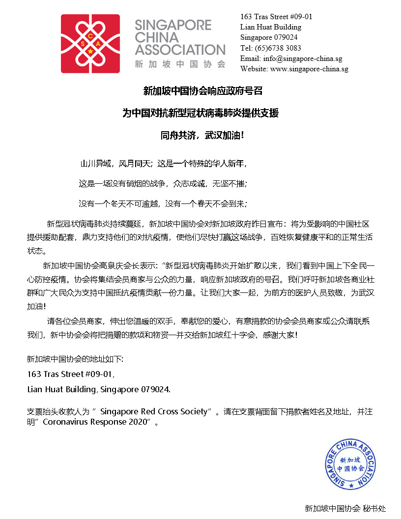新型冠状病毒肺炎持续蔓延,新加坡中国协会对新加坡政府昨日宣布:将为受影响的中国社区提供援助配套,鼎力支持他们的对抗疫情,使他们尽快打赢这场战争,百姓恢复健康平和的正常生活状态。