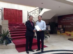 5月6日,新加坡中国协会副会长兼秘书长邹福来先生来会拜访。双方就在新加坡举办活动一事进行了工作会谈,邹福来并代表新加坡中国协会名誉会长、全国友协 “人民友好使者”获得者谢镛先生向会领导赠送了谢老亲书的《颐和庐即兴集》。